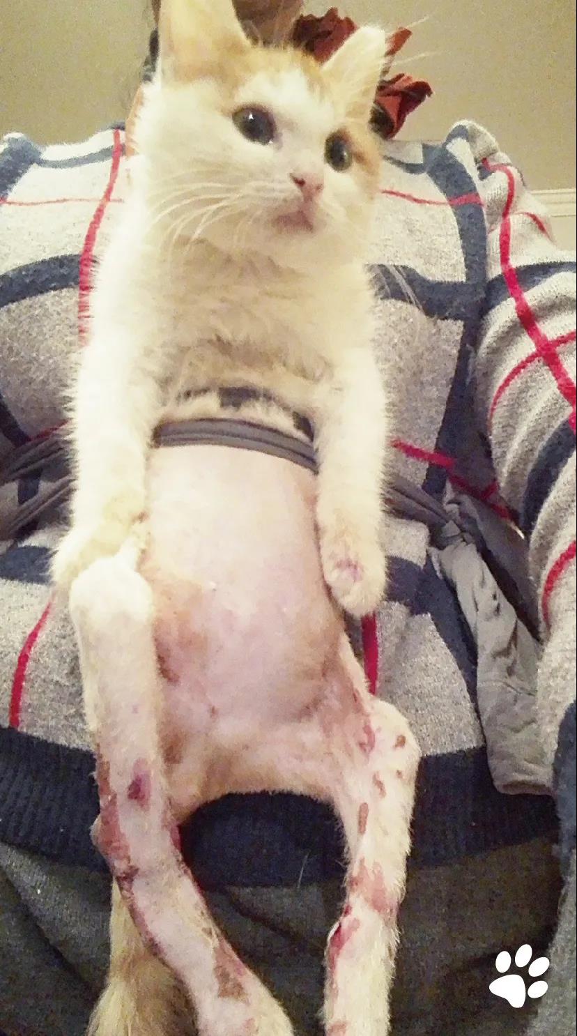 主人Kailing初见它的时候,就是在寄养点,寄养点需要被照顾的猫咪实在太多了,无法被精心照料的飞流,由于漏尿而导致肚子和后腿溃烂,形成了尿灼伤,当时的肚子和大腿上 已经没有一块皮肤是完整的。