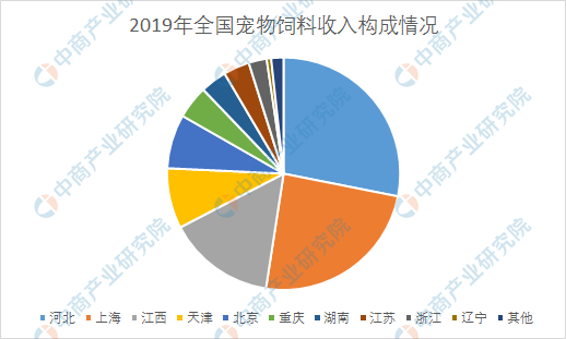 宠物饲料市场增长迅速 2019年全国宠物饲料产量达到87.08万吨,相比2018年的78.61万吨增长10.8%。从各地收入来看,全国实现宠物饲料收入97.56亿元,全国有9省市宠物饲料营业收入超过1亿元,有3省市收入在10亿以上。其中,河北和上海两省收入遥遥领先于其他省市。河北省收入位居全国第一,2019年共实现宠物饲料收入26.34亿元,占全国饲料收入比重27%。上海市宠物饲料收入为22.75亿元,占比23.32%;江西收入13.98亿元,占比14.33%。排名前三省市收入占总宠物饲料收入的64.65%。