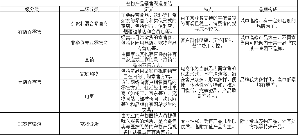 参考欧睿所使用的分类方法,我们将宠物产品的销售渠道分为两级六类。不同的销售渠道在交易方式、客户群体和商品品牌等方面有着明显差异,电商凭借其品牌档次全面和交易便捷的特点与其他渠道产生了明显的区分度。