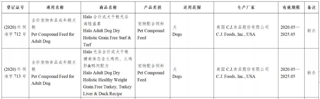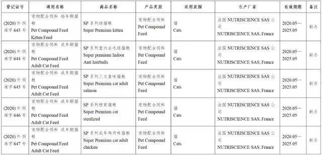 新获批登记明确用于宠物进口饲料和饲料添加剂产品(有效期2020.05—2025.05)的名单包括:
