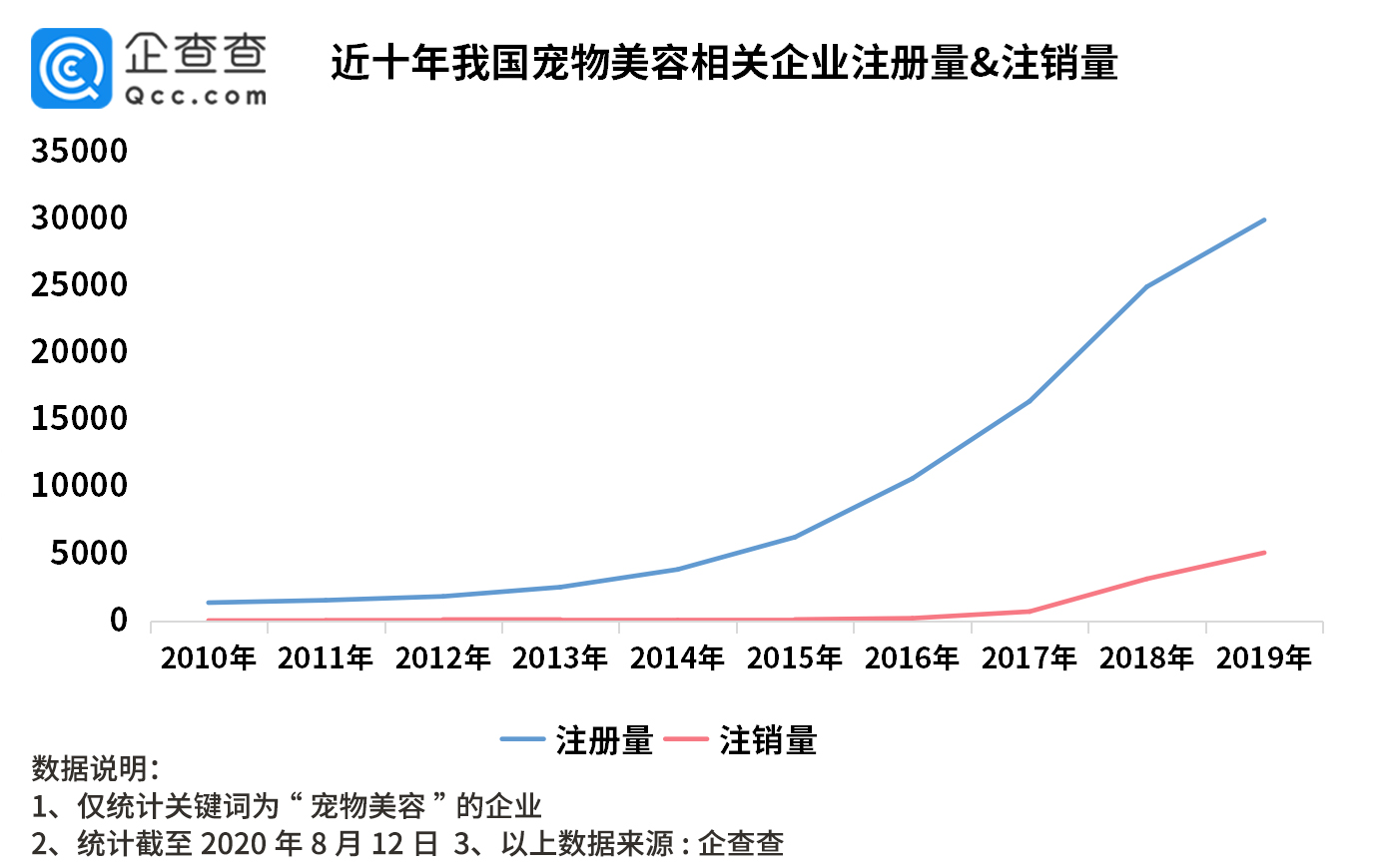 企查查数据显示,近十年宠物美容相关企业注册量持续上升,从2014年开始,宠物美容进入高速发展期,2014年-2018年相关企业年均注册量达到1.2万家,2019年相关企业注册量近三万家,是2010年注册量的22倍。