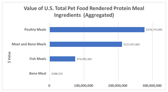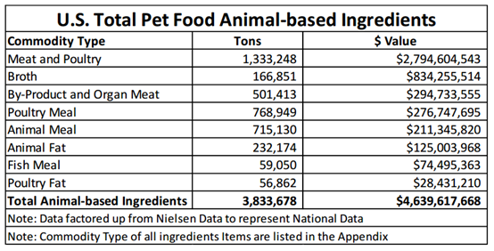 - 以动物为基础的产品有380多万吨,价值46亿美元,用于狗粮和猫粮:共有183万吨肉类和家禽产品,价值31亿美元;提供的蛋白质粉贡献了150万吨,价值5.63亿美元;共有289,037吨动物及家禽脂肪,价值1.53亿元;肉汤成分总计166,851吨,价值8.34亿美元。