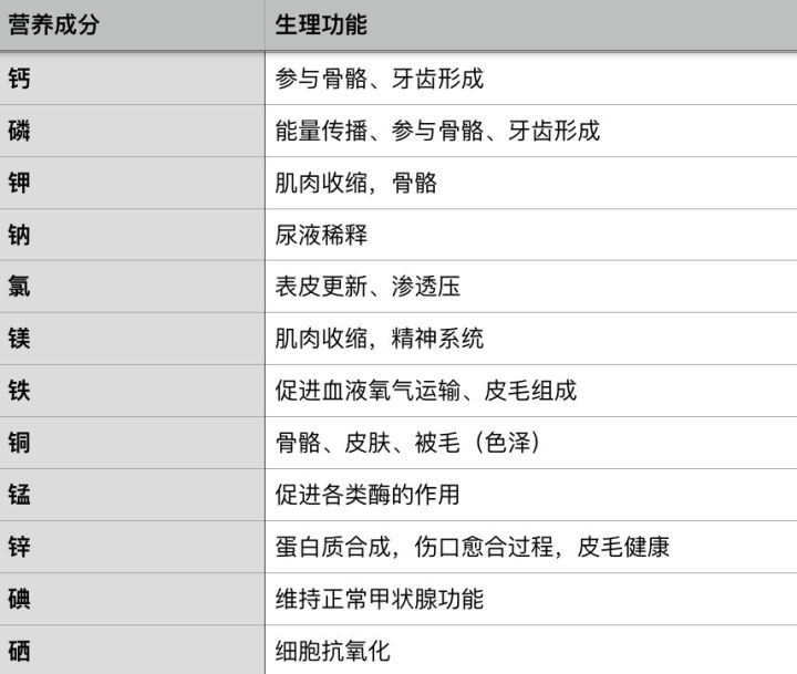 常量矿物质包括钙、磷、镁、硫、钠、氯和钾,微量矿物质元素包 括铁、铜、锰、锌、硒、碘。其它可能对猫起重要作用的微量元素有铬、氟、钼、硅、砷、镍和钒。