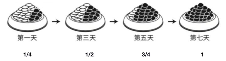 最后温馨提醒,由于部分宠物消化系统对食物的变化敏感,尤其是之前一直食用干粮的狗狗,对高蛋白喂食可能出现肠胃不适的情况。在选择新鲜食物饲喂后,循序渐进的换粮过程可减轻宠物的肠胃刺激。建议采用 7日换粮法 ,具体比例如下图: